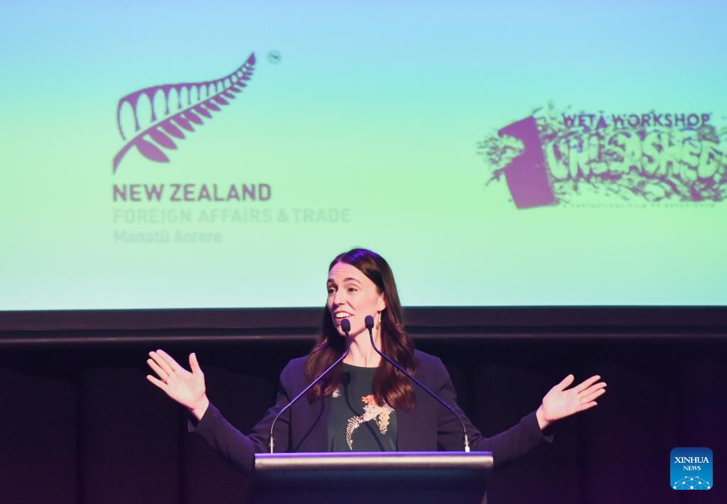 New Zealand Prime Minister Jacinda Ardern addresses a reception marking the 50th anniversary of diplomatic relations between New Zealand and China in Auckland, New Zealand, Dec. 9, 2022. The relationship with China makes an important contribution to New Zealand's prosperity, Ardern said at the event, noting that New Zealand's relationship with China is complex and evolving. (Xinhua/Guo Lei)