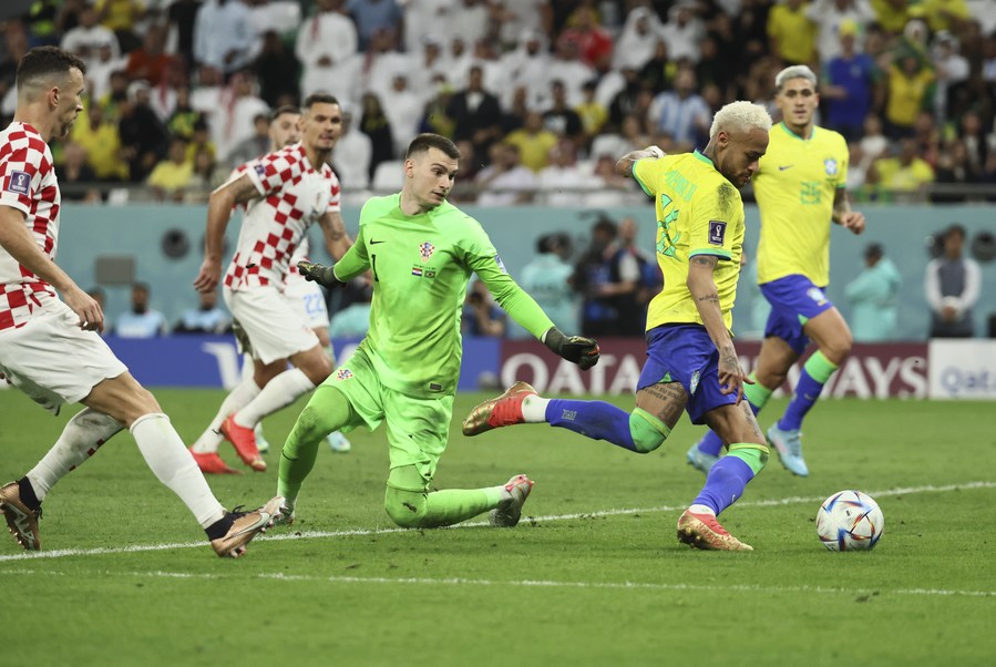 Neymar (2nd R) of Brazil shoots to score during the Quarterfinal match between Croatia and Brazil of the 2022 FIFA World Cup at Education City Stadium in Al Rayyan, Qatar, Dec. 9, 2022. (Xinhua/Lan Hongguang)