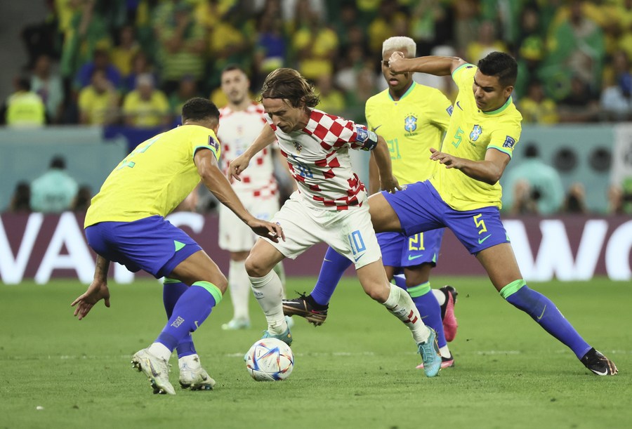 Luka Modric (C, front) of Croatia competes during the Quarterfinal match between Croatia and Brazil of the 2022 FIFA World Cup at Education City Stadium in Al Rayyan, Qatar, Dec. 9, 2022. (Xinhua/Lan Hongguang)