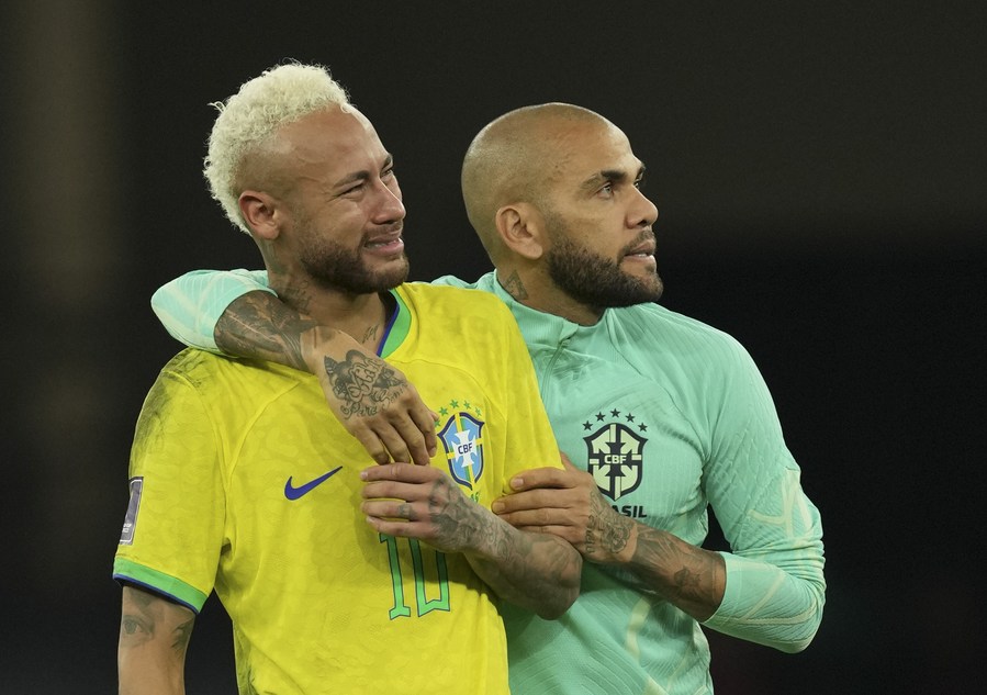 Ederson (R), goalkeeper of Brazil, comforts Neymar of Brazil after the quarterfinal match between Croatia and Brazil of the 2022 FIFA World Cup at Education City Stadium in Al Rayyan, Qatar, Dec. 9, 2022. (Xinhua/Xiao Yijiu)