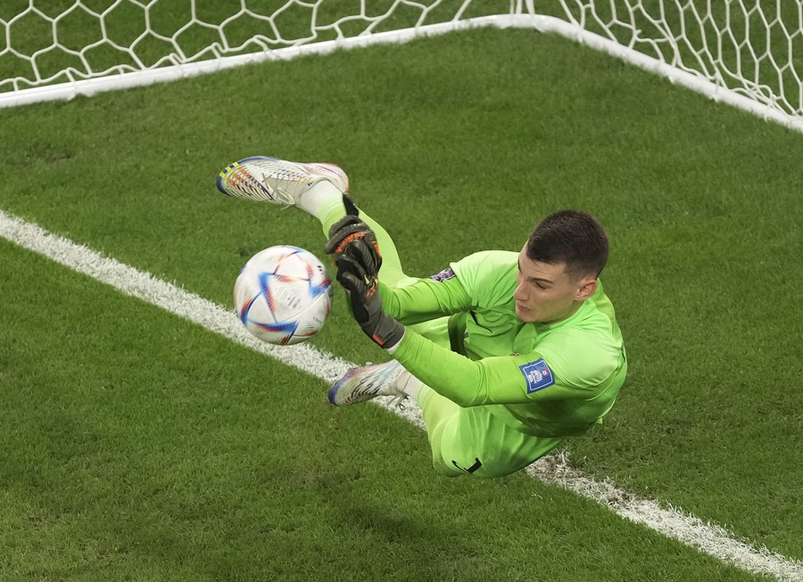 Dominik Livakovic, goalkeeper of Croatia, makes a save during the penalty shoot-out of the Quarterfinal match between Croatia and Brazil of the 2022 FIFA World Cup at Education City Stadium in Al Rayyan, Qatar, Dec. 9, 2022. (Xinhua/Meng Yongmin)