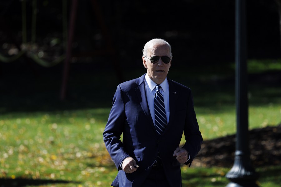 U.S. President Joe Biden walks on the South Lawn to board Marine One at the White House in Washington, D.C., the United States, on Oct. 27, 2022. (Photo by Ting Shen/Xinhua)
