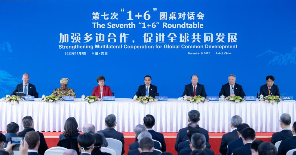 Chinese Premier Li Keqiang meets the press jointly with President of the World Bank Group David Malpass, Managing Director of the International Monetary Fund Kristalina Georgieva, Director-General of the World Trade Organization Ngozi Okonjo-Iweala, Secretary-General of the Organization for Economic Cooperation and Development Mathias Cormann, Chairman of the Financial Stability Board Klaas Knot, and Changhee Lee, special representative of Director-General Gilbert Houngbo of the International Labor Organization, after holding the seventh "1+6" Roundtable in Huangshan, east China's Anhui Province, Dec. 9, 2022. (Xinhua/Zhai Jianlan)