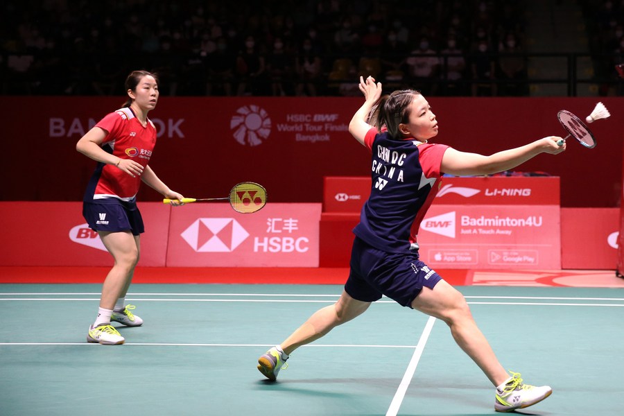 Chen Qingchen (R) and Jia Yifan of China in action against Benyapa Aimsaard and Nuntakarn Aimsaard of Thailand during the women's doubles final. (Xinhua/Wang Teng)
