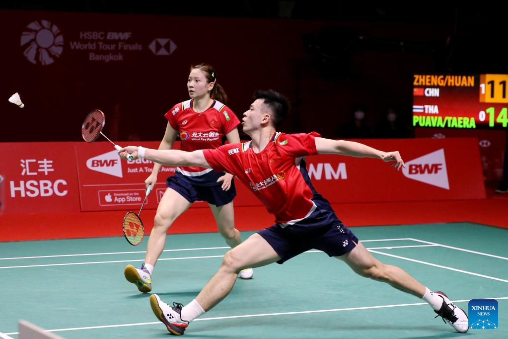 Zheng Siwei (top)/Huang Yaqiong of China compete against Dechapol Puavaranukroh/Sapsiree Taerattanachai of Thailand during the mixed doubles final at the BWF World Tour Finals 2022 in Bangkok, Thailand, Dec. 11, 2022. (Xinhua/Wang Teng)