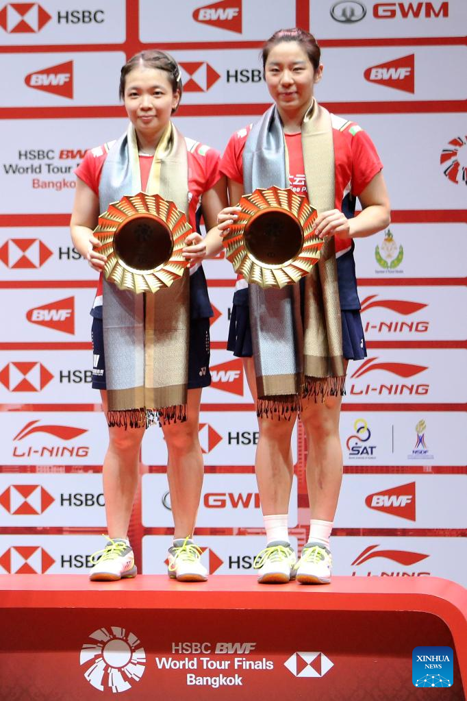 Chen Qingchen (L)/Jia Yifan of China pose on the podium after the women's doubles final against Benyapa Aimsaard/Nuntakarn Aimsaard of Thailand at the BWF World Tour Finals 2022 in Bangkok, Thailand, Dec. 11, 2022. (Xinhua/Wang Teng)