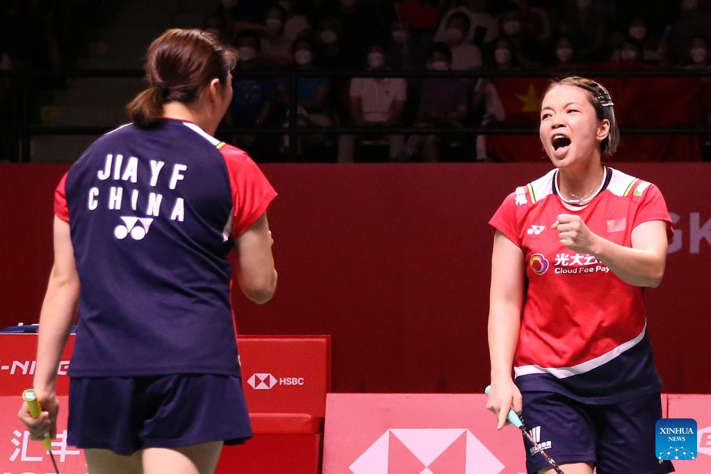 Chen Qingchen (R)/Jia Yifan of China celebrate scoring during the women's doubles final against Benyapa Aimsaard/Nuntakarn Aimsaard of Thailand at the BWF World Tour Finals 2022 in Bangkok, Thailand, Dec. 11, 2022. (Xinhua/Wang Teng)