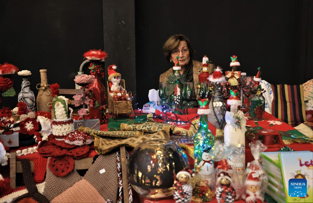 A vendor sells handmade Christmas items and decorations at a flea market in Beirut, Lebanon, Dec. 10, 2022. (Xinhua/Liu Zongya)