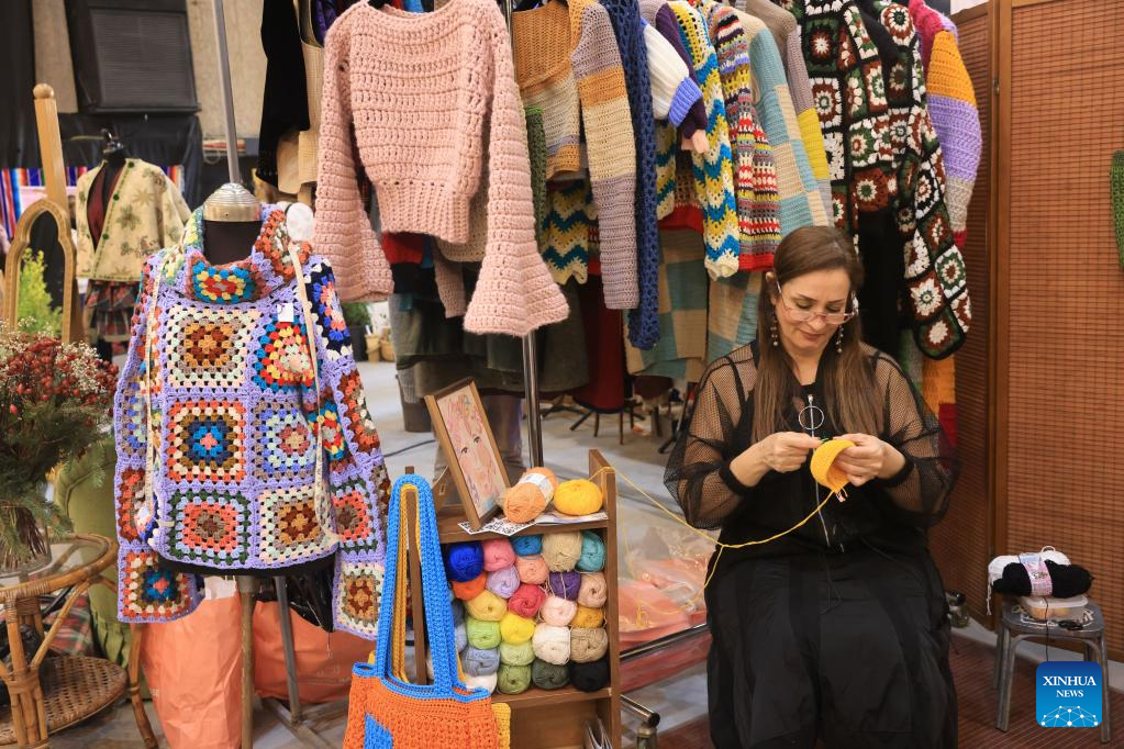 A woman does needlework at her stall in a flea market in Beirut, Lebanon, Dec. 10, 2022. (Xinhua/Liu Zongya)
