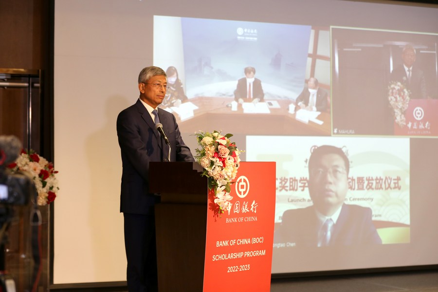 Chinese Ambassador to Myanmar Chen Hai speaks at the Bank of China (BOC) Scholarship Program Launch and Distribution Ceremony in Yangon, Myanmar, Dec. 9, 2022. (Photo by Myo Kyaw Soe/Xinhua)
