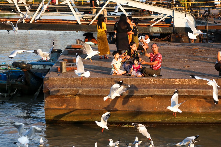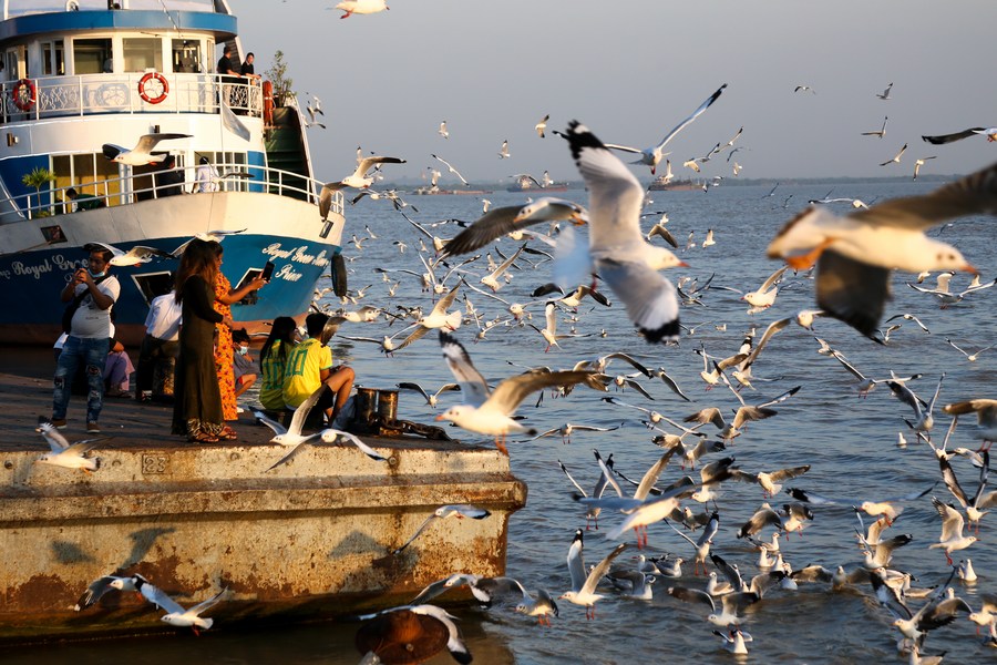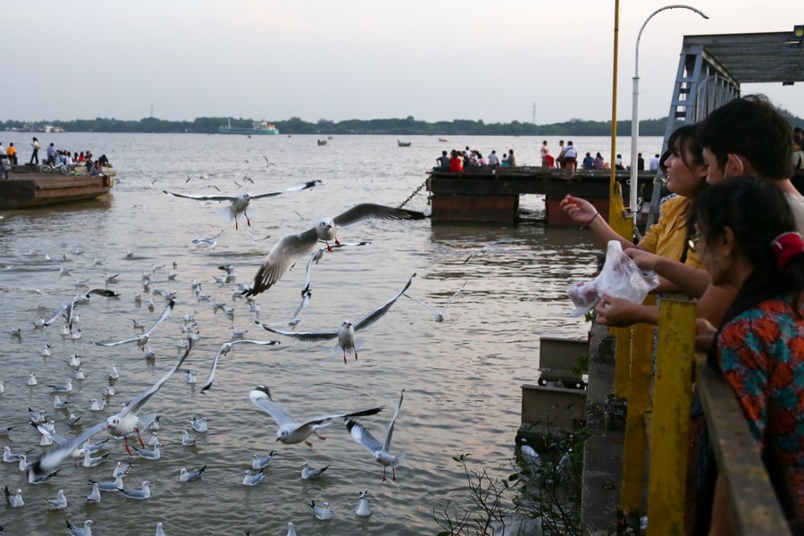 People feed seagulls near a jetty of the Yangon River in Yangon, Myanmar on Dec. 10, 2022. (Photo by Myo Kyaw Soe/Xinhua)