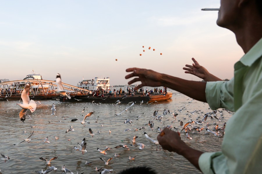 People feed seagulls near a jetty along the Yangon River in Yangon, Myanmar on Dec. 10, 2022. (Photo by Myo Kyaw Soe/Xinhua)