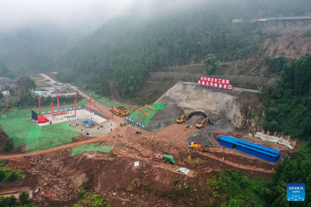 This aerial photo taken on Dec. 11, 2022 shows a tunnel under construction at the Chongqing section of Chengdu-Dazhou-Wanzhou high-speed railway in southwest China's Chongqing Municipality. The Chongqing section of Chengdu-Dazhou-Wanzhou high-speed railway started construction on Sunday. (Xinhua/Tang Yi)