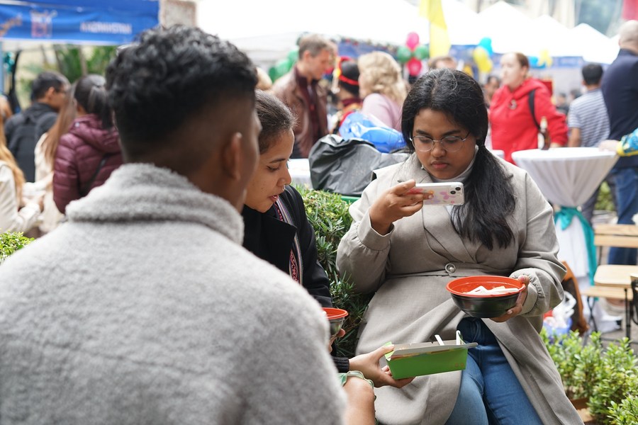 People enjoy food at the 2022 International Food Festival in Hanoi, Vietnam on Dec. 11, 2022. (Xinhua/Hu Jiali)