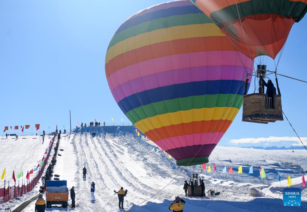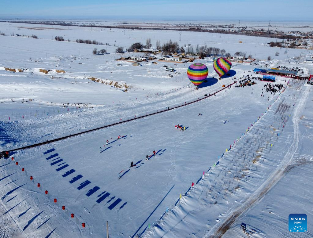 This aerial photo taken on Dec.12, 2022 shows opening ceremony of the 2nd snow and ice tourism carnival in Kazak Autonomous County of Mori, northwest China's Xinjiang Uygur Autonomous Region. The 2nd snow and ice tourism carnival in Kazak Autonomous County of Mori kicked off on Monday. (Xinhua/Hao Jianwei)