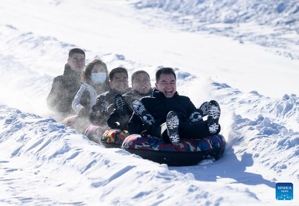 People participate in snow entertainment at a ski resort in Kazak Autonomous County of Mori, northwest China's Xinjiang Uygur Autonomous Region, Dec. 12, 2022. The 2nd snow and ice tourism carnival in Kazak Autonomous County of Mori kicked off on Monday. (Xinhua/Wang Fei)
