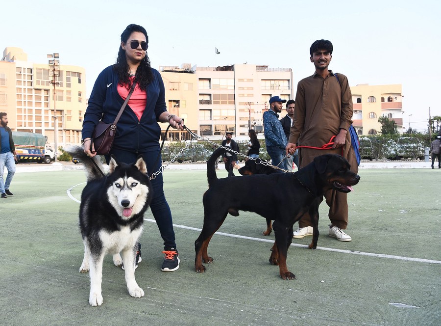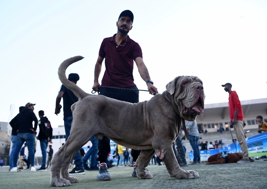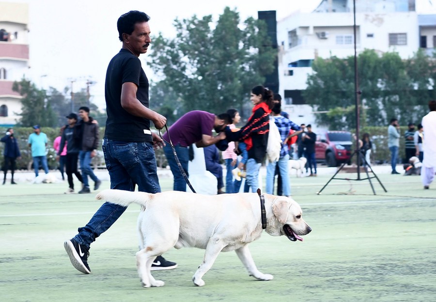 A man participates with his dog in a dog show in Karachi, Pakistan on Dec. 11, 2022. (Str/Xinhua)