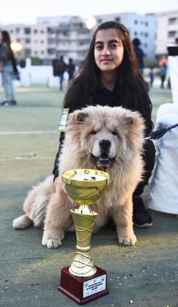 A girl poses for a photo with her dog during a dog show in Karachi, Pakistan on Dec. 11, 2022. (Str/Xinhua)