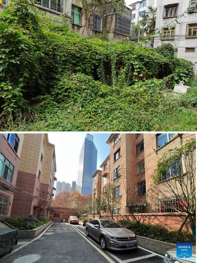 In this combo photo, the upper undated photo provided by the convergence media center of Xixiu District shows a view of the old Qingbaozhan community; and the lower photo taken by Li Jingya on Nov. 25, 2022 shows a view of the same community after renewal in Xixiu District of Anshun City, southwest China's Guizhou Province. (Xinhua)