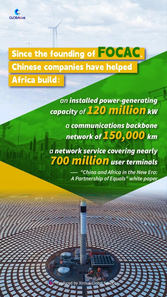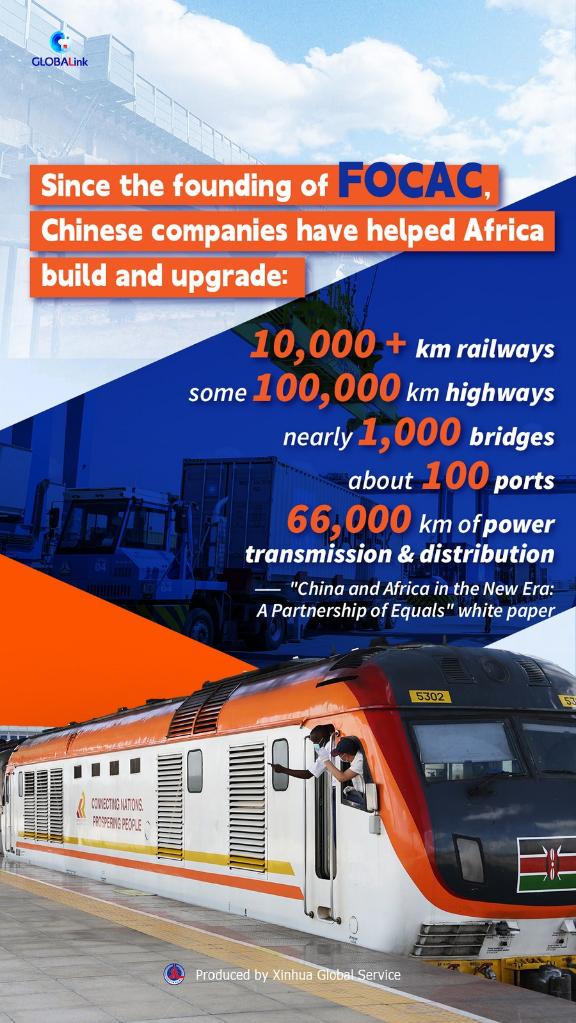 Between 2000 and 2020, China helped African countries build 13,000-plus-km-long railways, nearly 100,000 km of highways, about 1,000 bridges, nearly 100 ports and more than 80 large-scale power facilities.