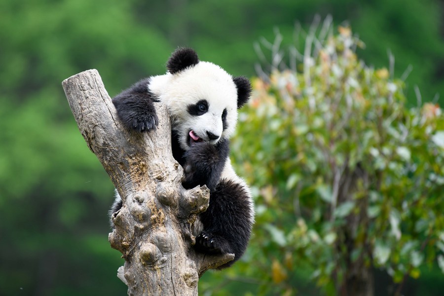 A giant panda climbs the trunk of a tree at Shenshuping base of China Conservation and Research Center for Giant Pandas in Wolong National Nature Reserve, southwest China's Sichuan Province, April 24, 2022. (Xinhua/Xu Bingjie)■