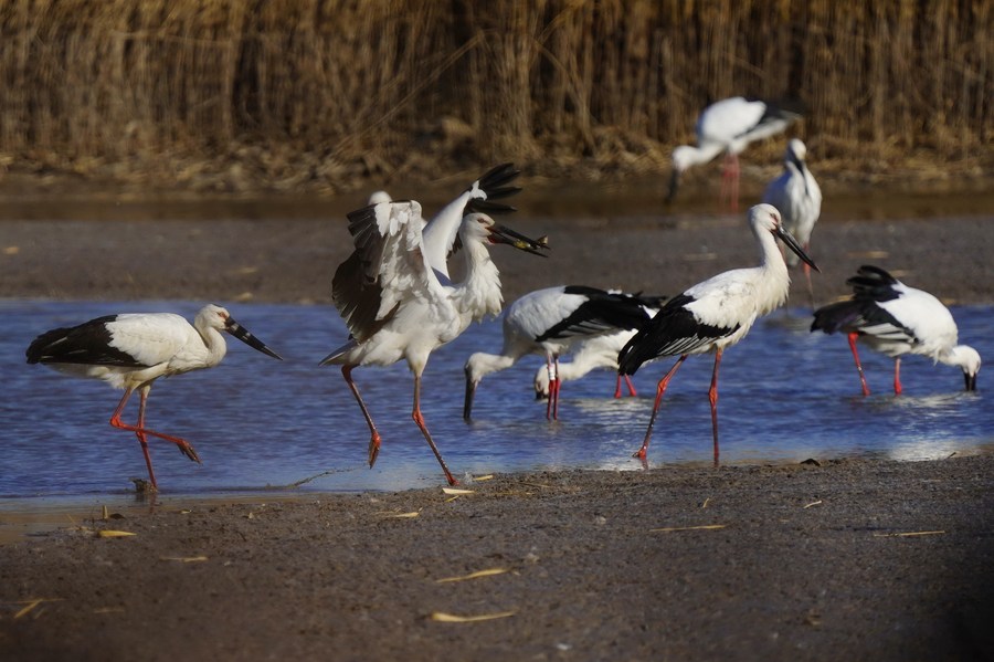 A flock of oriental white storks forage during their southward migration at Caofeidian wetland in Tangshan, north China's Hebei Province, Nov. 14, 2021. (Xinhua/Yang Shiyao)