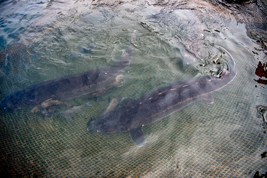 Photo taken on Feb. 25, 2022 shows Yangtze sturgeons at a breeding base for rare fishes in the Three Gorges Reservoir in southwest China's Chongqing. (Xinhua/Tang Yi)