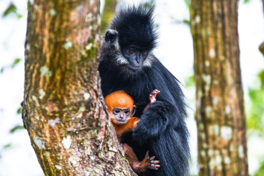A Francois' leaf monkey is seen with a cub in the Mayanghe National Nature Reserve in Guizhou Province, southwest China, March 16, 2022. (Xinhua/Yang Wenbin)