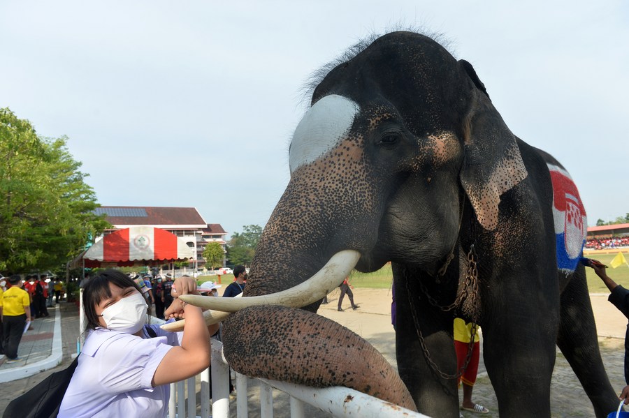 A student takes photos with an elephant at a school in Ayutthaya, Thailand, on Dec. 13, 2022. (Xinhua/Rachen Sageamsak) ■