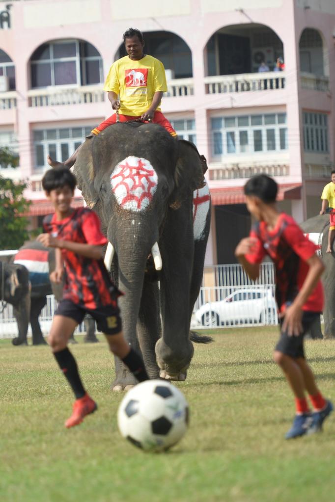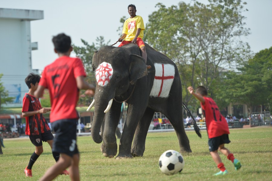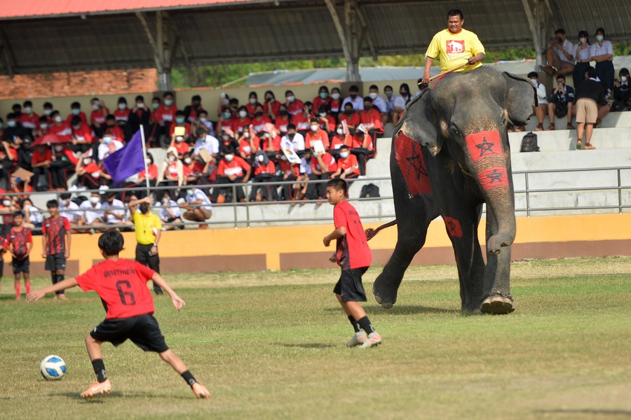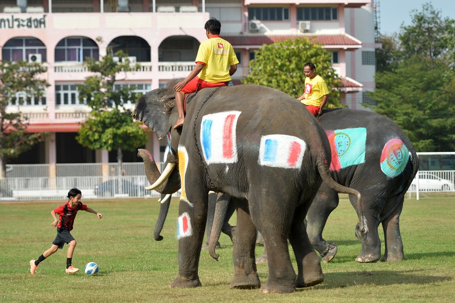 A student plays soccer with elephants at a school in Ayutthaya, Thailand, on Dec. 13, 2022. (Xinhua/Rachen Sageamsak)