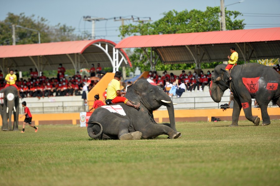 AYUTTHAYA, Thailand, Dec. 14 (Xinhua) -- Thai students play soccer with elephants to celebrate the ongoing FIFA World Cup Qatar 2022.