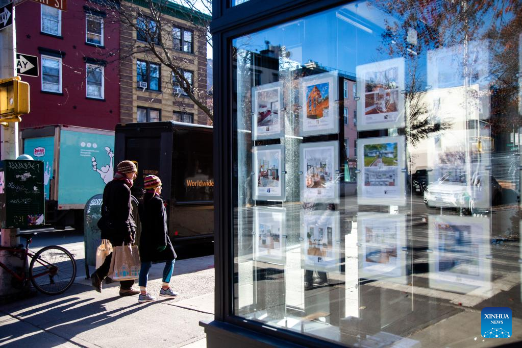 People walk past listings of houses for sale at a realty office in the Brooklyn borough of New York, the United States, Dec. 13, 2022. U.S. prices rose less than analysts' expectations in November, signaling that surging inflation may be slightly tamping down. The consumer price index (CPI), a measure of U.S. services and goods, climbed a mere 0.1 percent from October, and rose 7.1 percent from the same time last year, according to data released Tuesday from the U.S. Department of Labor. (Photo by Michael Nagle/Xinhua)