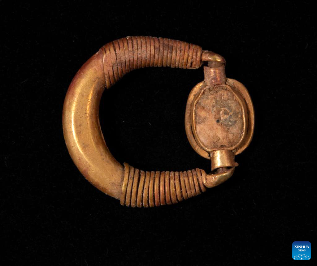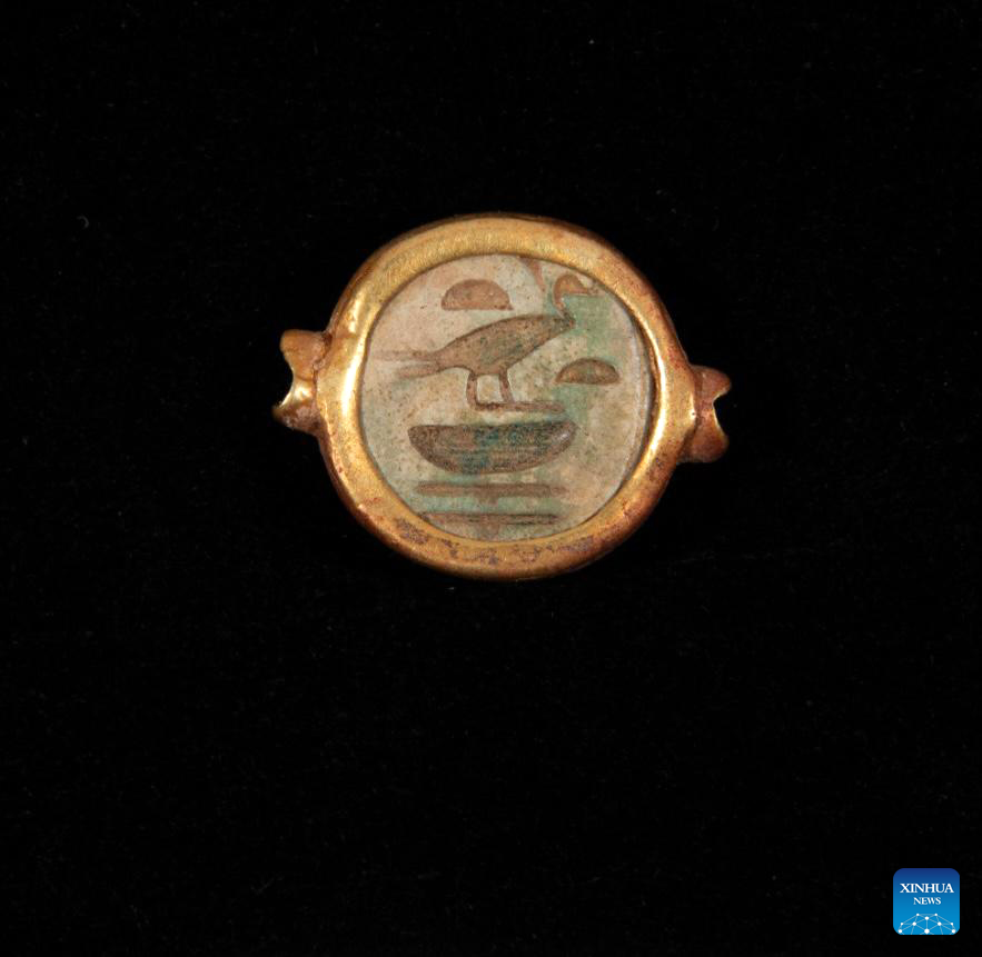Undated photo shows an ancient gold ring discovered in the ancient city of Amarna, Minya Governorate, Egypt. An Egyptian-British archaeological mission discovered a collection of gold jewelry south of the capital Cairo, said the Egyptian Ministry of Tourism and Antiquities on Tuesday. "The find, discovered in the ancient city of Amarna, comprised three gold rings, one of which is decorated with a depiction of the ancient Egyptian Bes, god of fun, and the second is inscribed with a phrase in hieroglyphics that means a lady of the two lands," the ministry said in a statement. (Egyptian Ministry of Tourism and Antiquities/Handout via Xinhua)