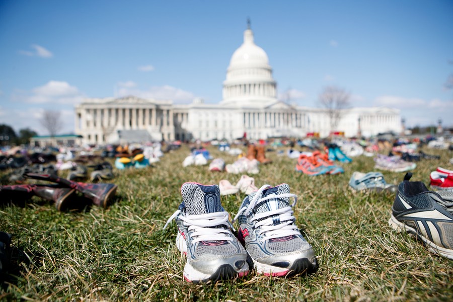 Shoes representing the children killed in school shootings since Sandy Hook Elementary School shooting in 2012 are seen on the lawn in front of the Capitol in Washington, D.C., the United States, on March 13, 2018. (Xinhua/Ting Shen)