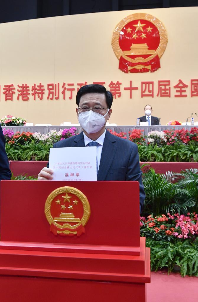 Chief Executive of the Hong Kong Special Administrative Region (HKSAR) John Lee, also standing chairman of the presidium of the Conference for Electing Deputies of the HKSAR to the 14th National People's Congress (NPC), casts his ballot at the second plenary session of the electoral conference in south China's Hong Kong, Dec. 15, 2022.(Xinhua/Chen Duo)