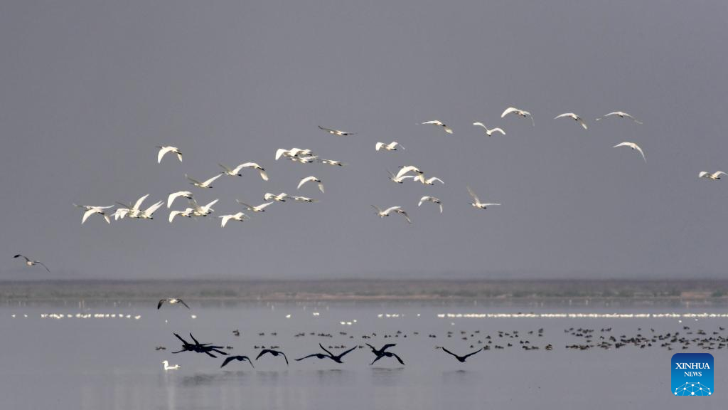 This photo taken on Dec. 14, 2022 shows migratory birds at Hengling Lake Provincial Nature Reserve, a part of Dongting Lake wetland, central China's Hunan Province. Wintering migrant birds have recently arrived at Dongting Lake wetland. (Xinhua/Zhao Zhongzhi)