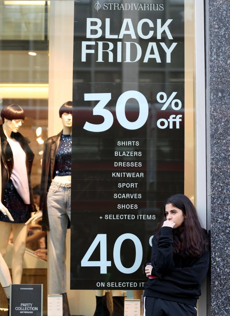 A woman stands next to a Black Friday promotion sign in a shop window in Oxford Street in London, Britain, Nov. 25, 2022. (Xinhua/Li Ying)