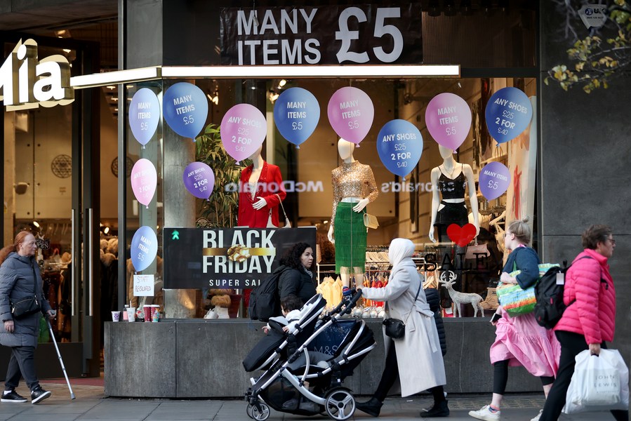 Shoppers walk in Oxford Street during Black Friday sales in London, Britain, Nov. 25, 2022. (Xinhua/Li Ying)