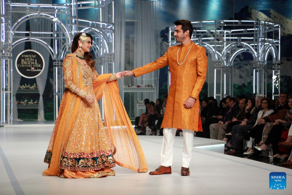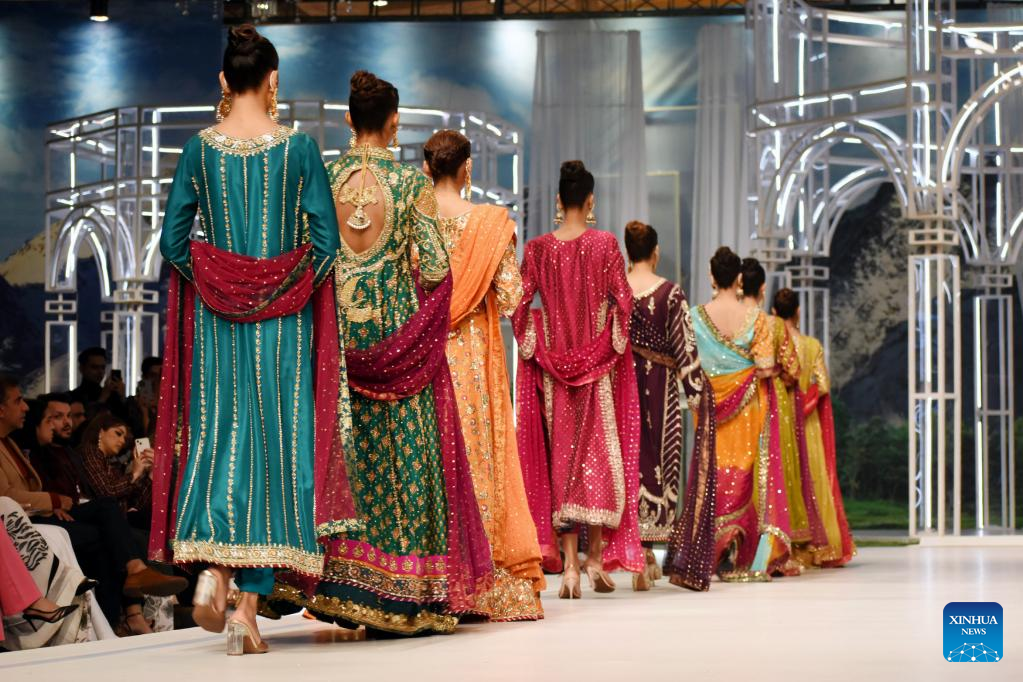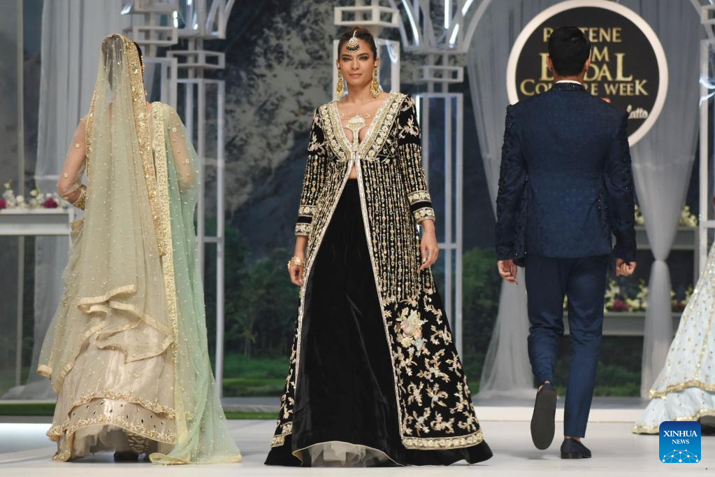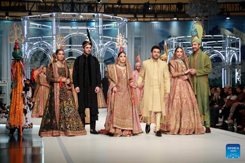 Models present creations during the Bridal Couture Week in Lahore, Pakistan on Dec. 16, 2022. (Photo by Jamil Ahmed/Xinhua)