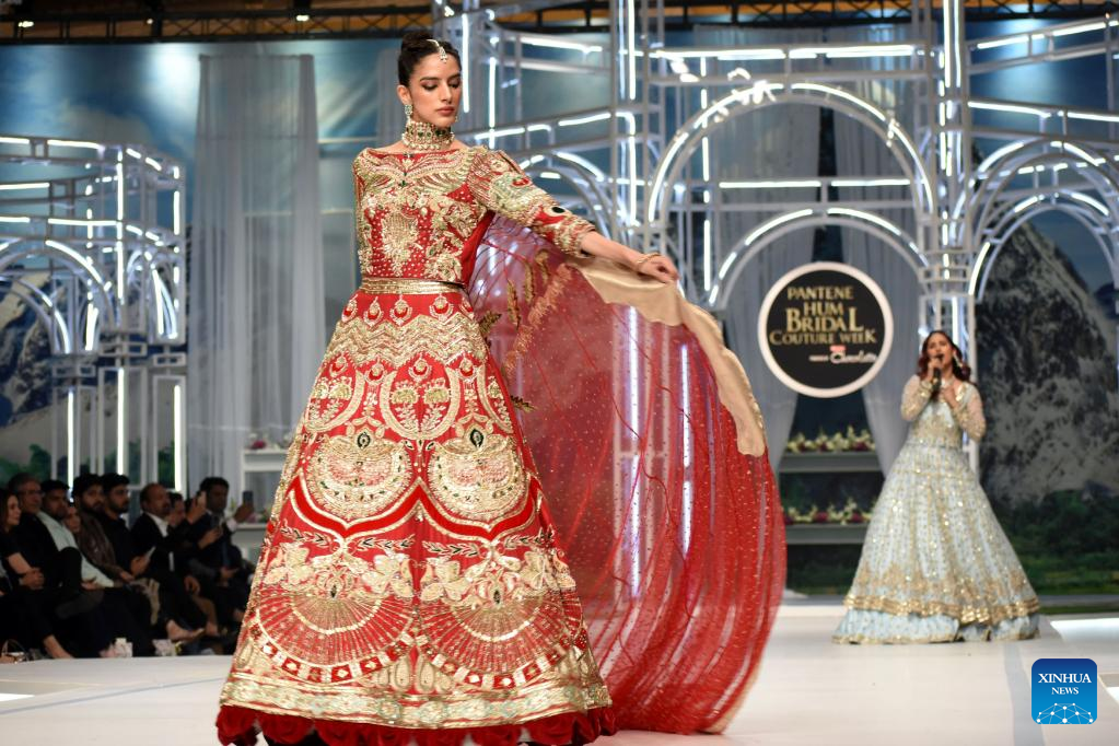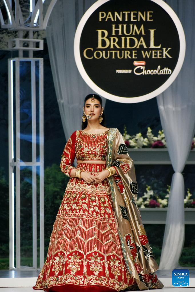 A model presents a creation during the Bridal Couture Week in Lahore, Pakistan on Dec. 16, 2022. (Photo by Sajjad/Xinhua)