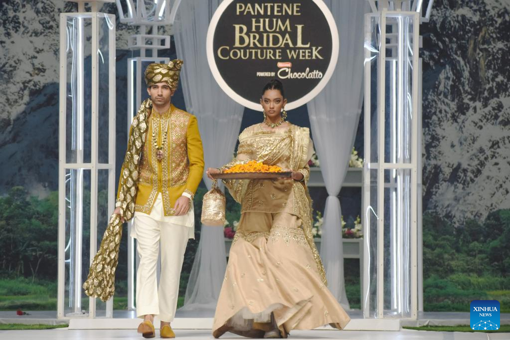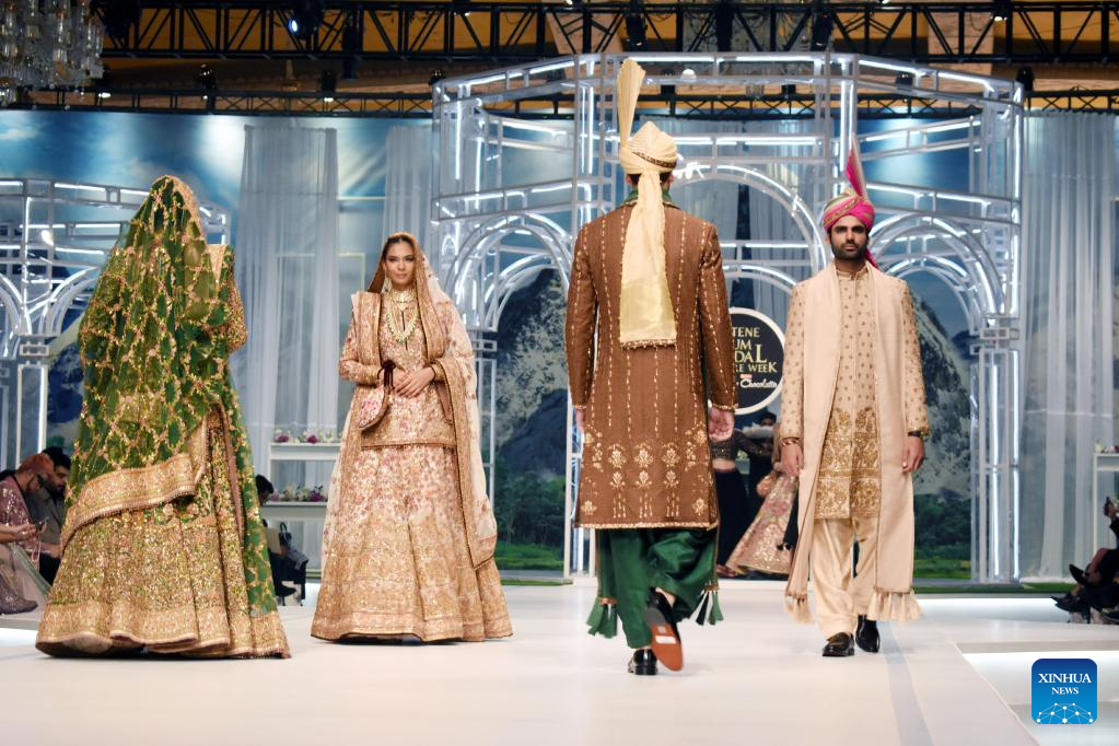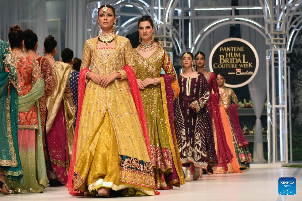 Models present creations during the Bridal Couture Week in Lahore, Pakistan on Dec. 16, 2022. (Photo by Sajjad/Xinhua)