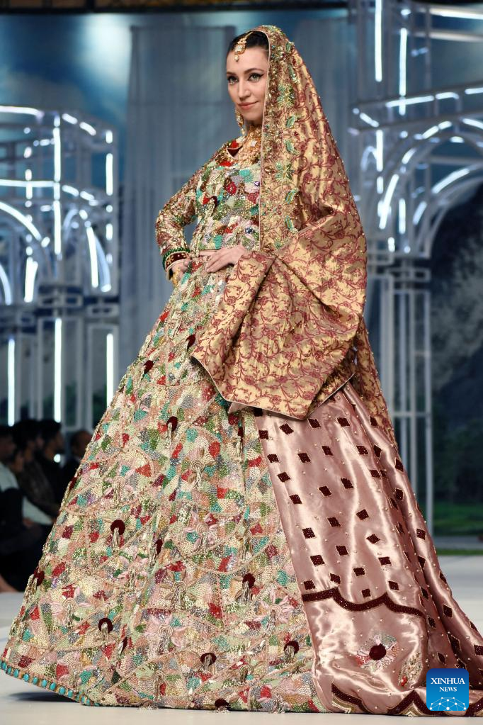 A model presents a creation during the Bridal Couture Week in Lahore, Pakistan on Dec. 16, 2022. (Photo by Jamil Ahmed/Xinhua)