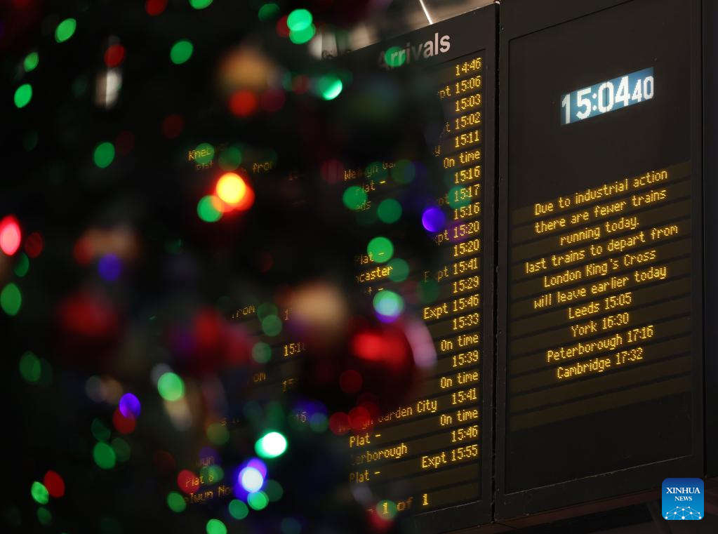 A notice of strike is seen next to a Christmas tree at King's Cross railway station in London, Britain, Dec. 17, 2022. The United Kingdom (UK) faces weeks of massive strikes during the Christmas season by transport and postal workers, nurses, and border guards. A wave of industrial action began on Tuesday, with more than 40,000 members of the National Union of Rail, Maritime and Transport Workers (RMT) walking out for 48 hours. Three more weeks of disruption are set to follow. (Xinhua/Li Ying)