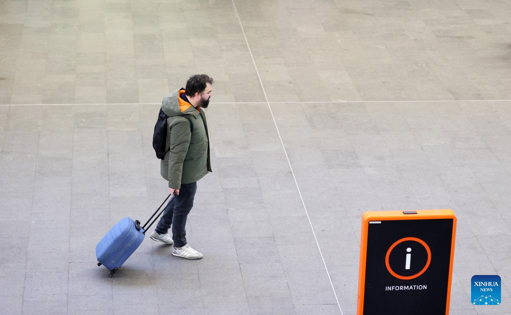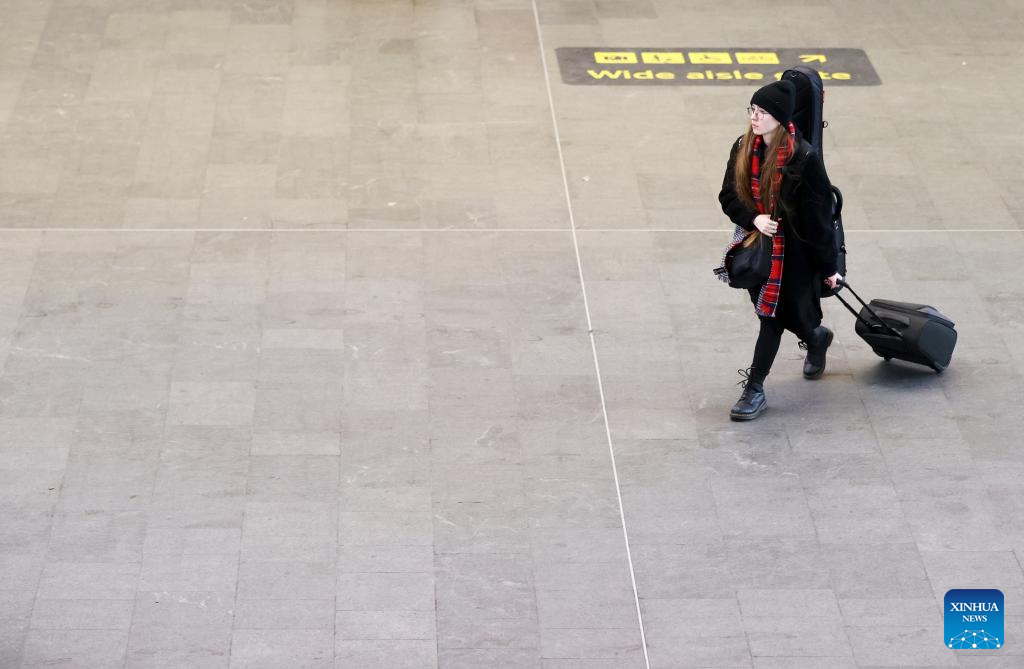 A passenger walks at King's Cross railway station in London, Britain, Dec. 17, 2022. The United Kingdom (UK) faces weeks of massive strikes during the Christmas season by transport and postal workers, nurses, and border guards. A wave of industrial action began on Tuesday, with more than 40,000 members of the National Union of Rail, Maritime and Transport Workers (RMT) walking out for 48 hours. Three more weeks of disruption are set to follow. (Xinhua/Li Ying)