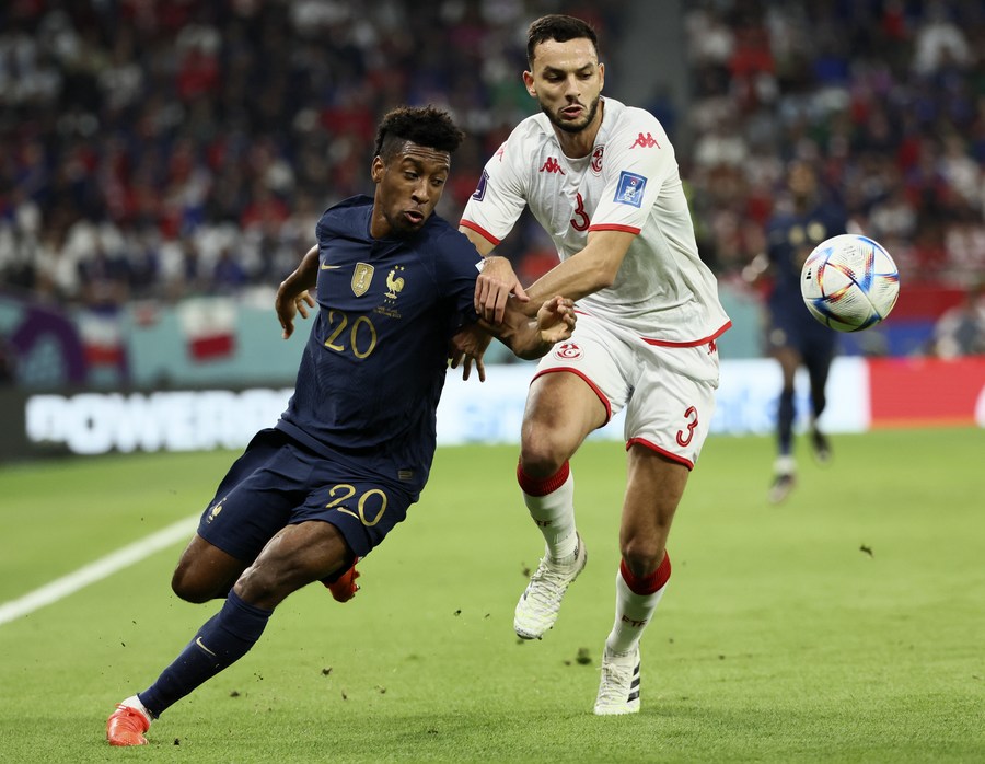 Kingsley Coman (L) of France vies with Montassar Talbi of Tunisia during the Group D match between Tunisia and France at the 2022 FIFA World Cup at Education City Stadium in Al Rayyan, Qatar, Nov. 30, 2022. (Xinhua/Lan Hongguang)