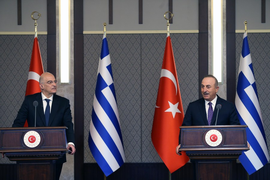 Turkish Foreign Minister Mevlut Cavusoglu (R) and Greek Foreign Minister Nikos Dendias attend a joint press conference in Ankara, Turkey, on April 15, 2021. (Photo by Mustafa Kaya/Xinhua)