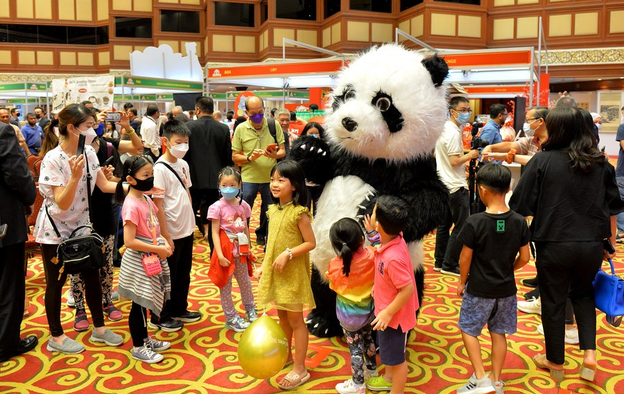 Children pose with a panda mascot during a China Day cultural event in Bandar Seri Begawan, Brunei, on Dec. 16, 2022. (Photo by Jeffrey Wong/Xinhua)