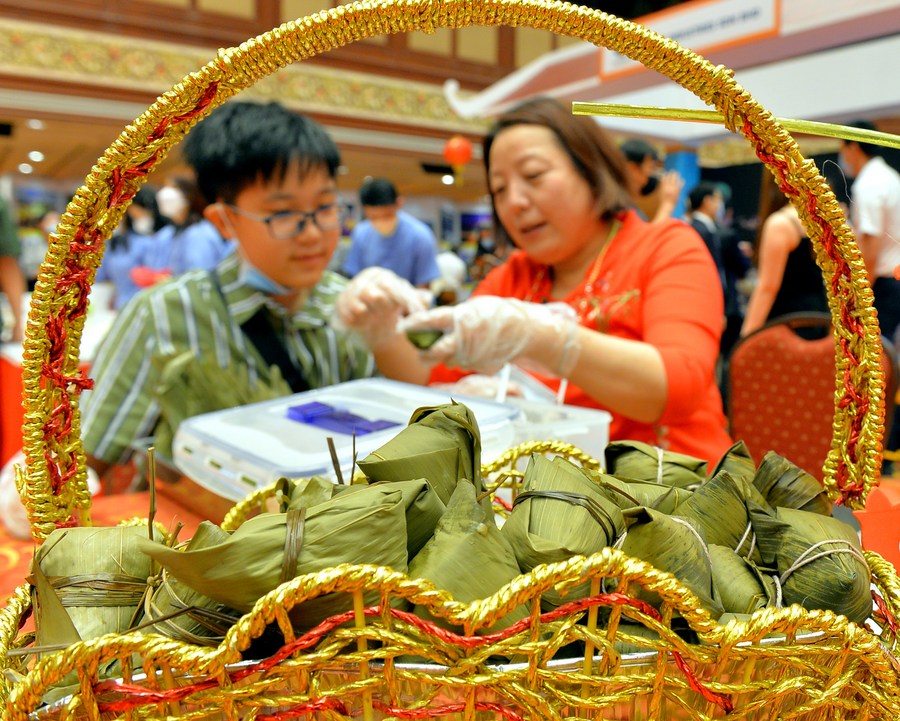 People make Zongzi, a traditional Chinese food, during a China Day cultural event in Bandar Seri Begawan, Brunei, on Dec. 16, 2022. (Photo by Jeffrey Wong/Xinhua)