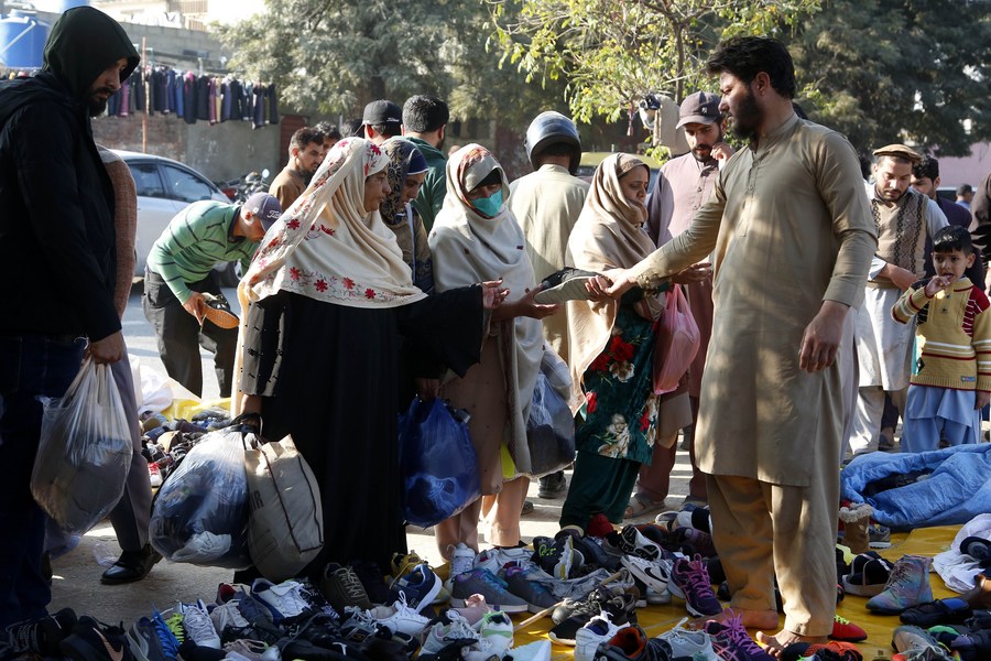 People buy shoes at a flea market in Islamabad, capital of Pakistan, on Dec. 18, 2022. (Xinhua/Ahmad Kamal)