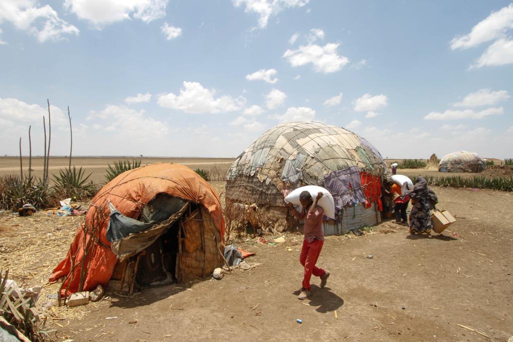 Local people carry relief food back home in Harores Wereda, Ethiopia, April 12, 2017. (Xinhua/Michael Tewelde)